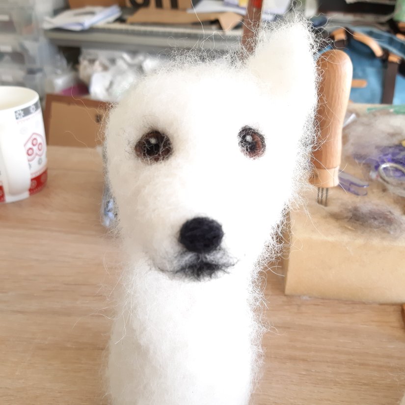 The features were the only part of the dog that had to be created with wool. Once the ears and the face were completed, I set about gently building up the fluff to give the dog the shape needed for this particular breed.